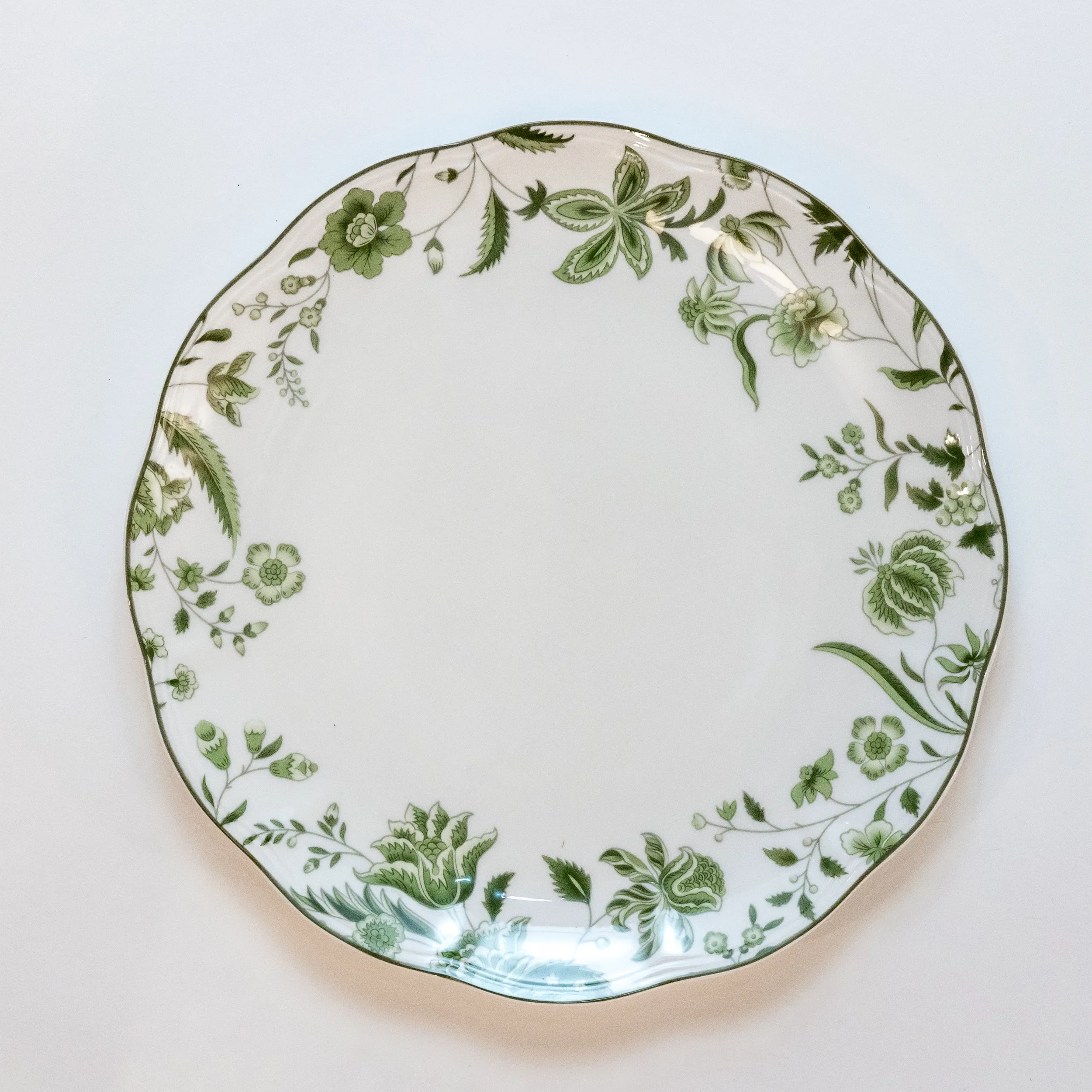 Bold porcelain plate with a 24 karat gold scalloped rim.